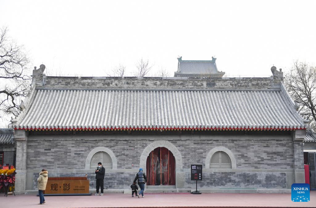 People visit an exhibition at Hong'en Temple in Beijing, capital of China, Jan. 18, 2024. The over 700-year-old Hong'en Temple opened to public recently. It is located to the north of the Bell Tower in Beijing, with Beijing Central Axis passing through its west annex hall.