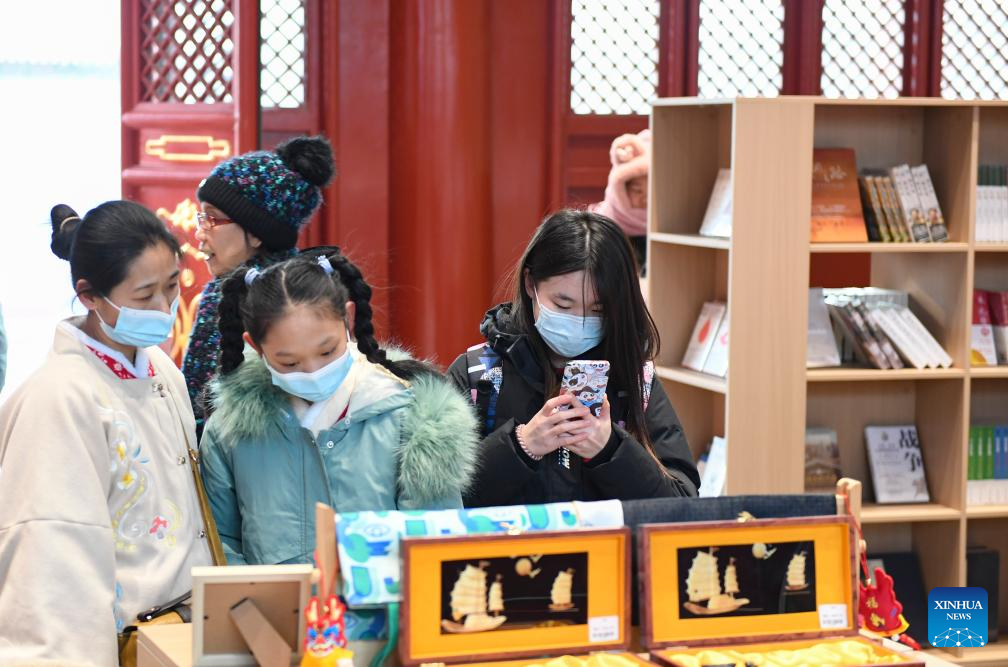 This photo taken on Jan. 18, 2024 shows a store where cultural products are on sale at the Hong'en Temple in Beijing, capital of China. The over 700-year-old Hong'en Temple opened to public recently. It is located to the north of the Bell Tower in Beijing, with Beijing Central Axis passing through its west annex hall.