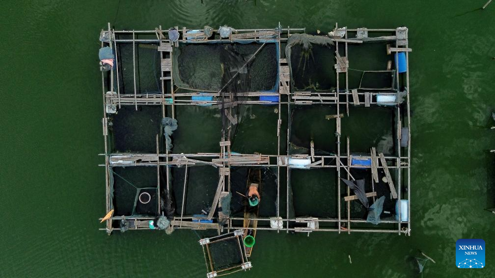 An aerial drone photo taken on Jan. 18, 2024 shows a fisherman working at a floating fish farm in Lhokseumawe, Aceh Province, Indonesia. (Photo by Fachrul Reza/Xinhua)