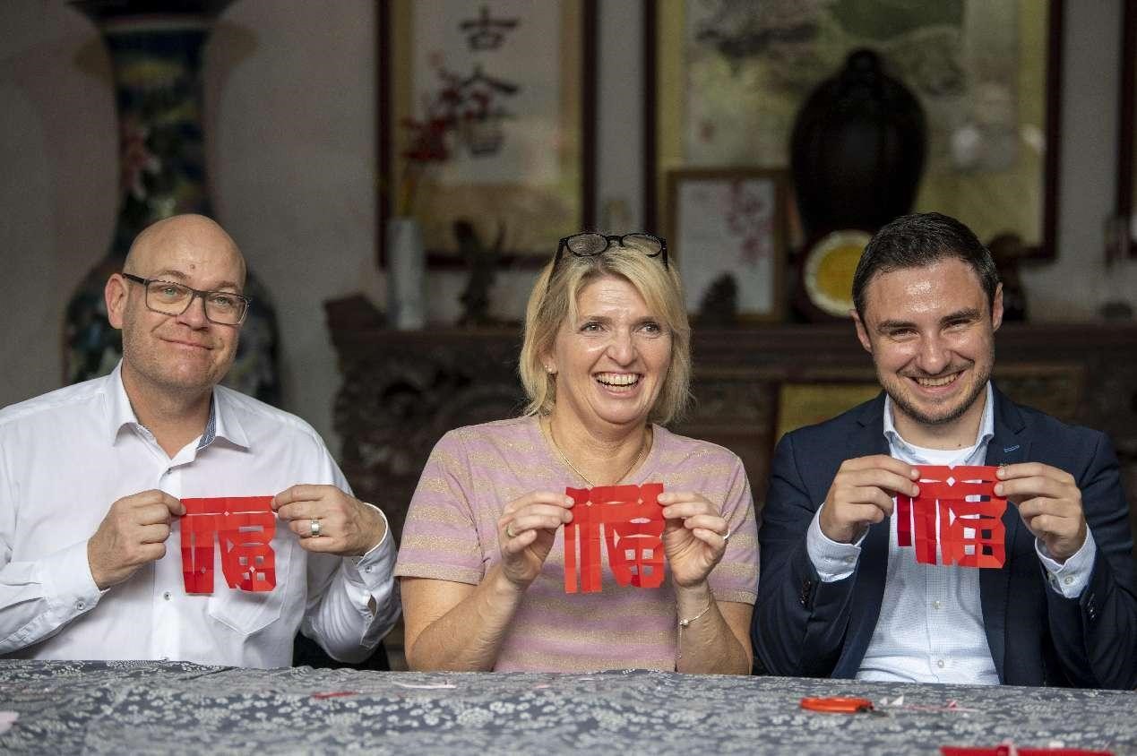 German visitors display their paper-cutting works at a museum of Chinese paper-cutting art in Jinhua city, east China's Zhejiang province. (People's Daily Online/Hu Xiaofei)