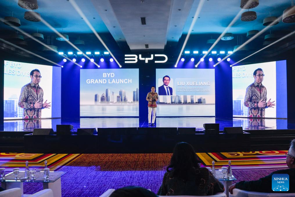 General Manager of BYD Asia-Pacific Auto Sales Division Liu Xueliang speaks during BYD grand launch in Jakarta, Indonesia, Jan. 18, 2024. China's BYD, a global leader in the sale of pure electric vehicles (EV), launched three new electric passenger cars, SEAL, Atto 3, and Dolphin, in Jakarta, Indonesia on Thursday to further expand in the Southeast Asia region. (Xinhua/Xu Qin)