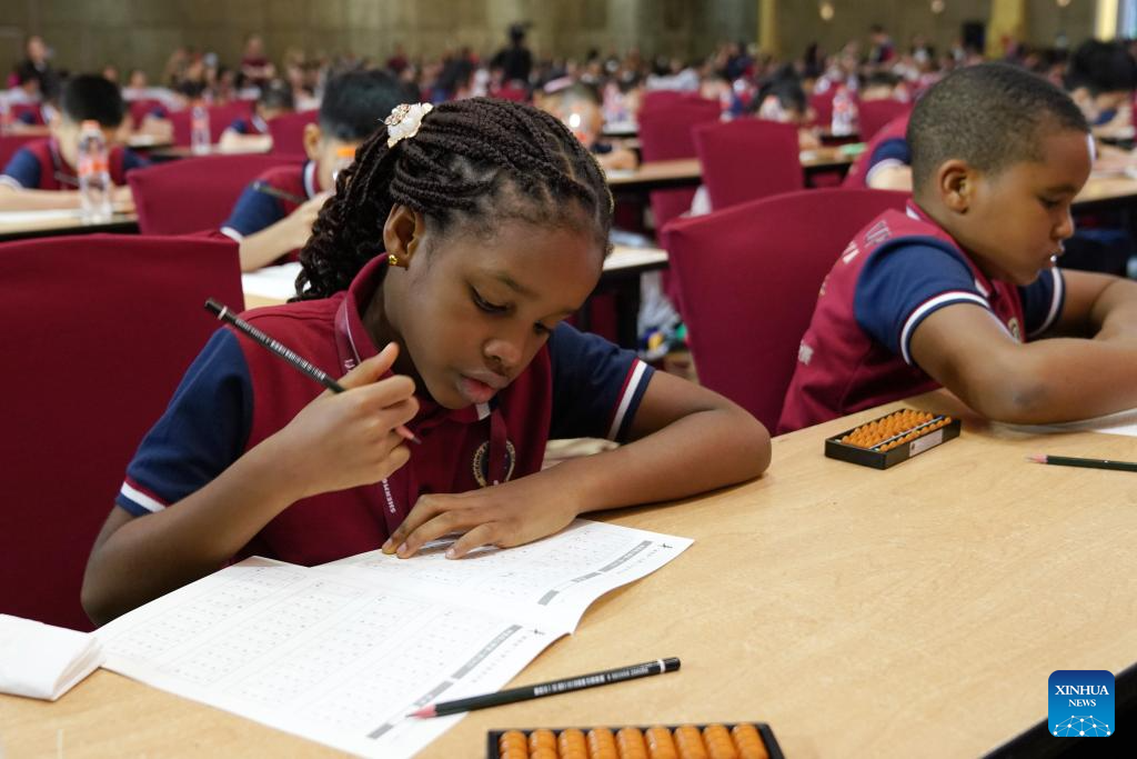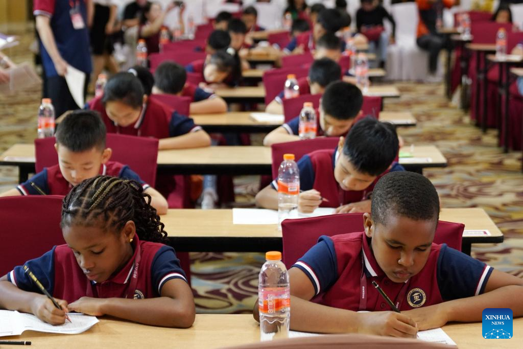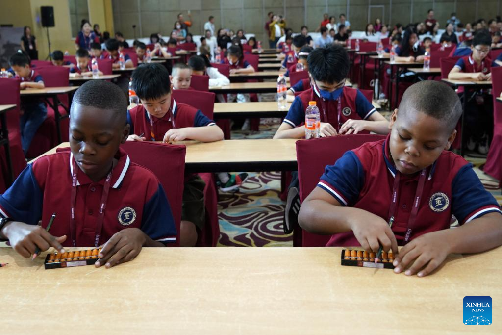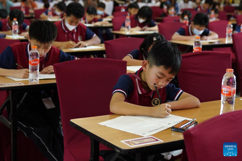 Contestants compete in the Third Indonesia "Shenmo Cup" International Abacus Mental Arithmetic Competition in Bandung, West Java, Indonesia, Jan. 20, 2024. The event kicked off on Saturday with nearly 200 children competing in this year's competition. (Xinhua/Ma Ning)