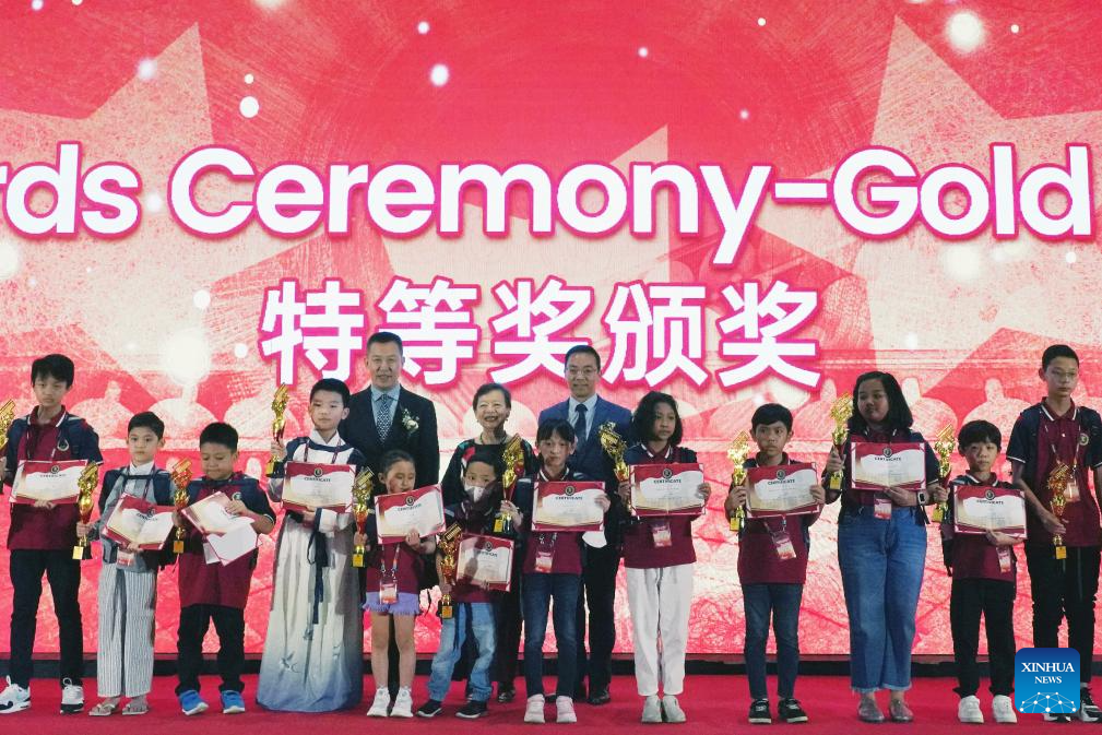 This photo taken on Jan. 20, 2024 shows the awards ceremony of the Third Indonesia "Shenmo Cup" International Abacus Mental Arithmetic Competition in Bandung, West Java, Indonesia. The event kicked off on Saturday with nearly 200 children competing in this year's competition. (Xinhua/Ma Ning)