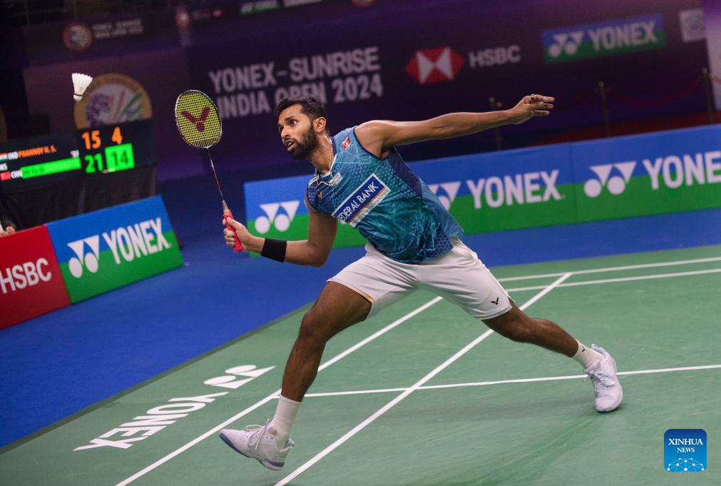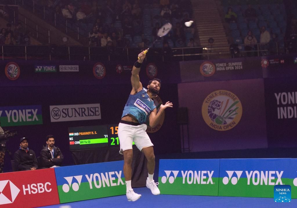Prannoy H. S. of India competes during the men's singles semi-final match against Shi Yuqi of China at the India Open 2024 badminton tournament in New Delhi, India, Jan. 20, 2024. (Xinhua/Javed Dar)