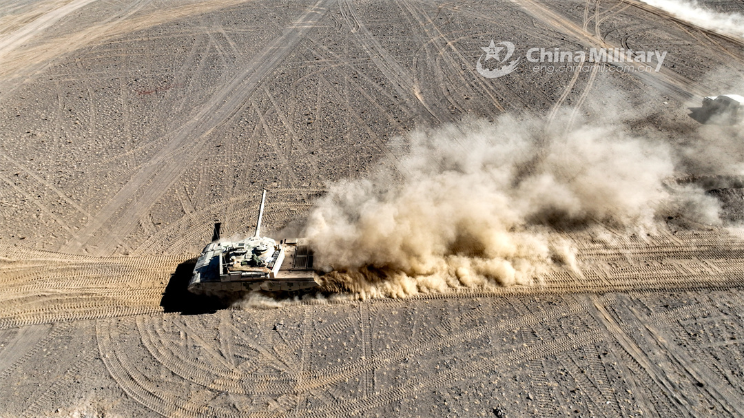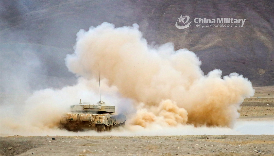 A main battle tank attached to a brigade under the PLA 77th Group Army maneuvers in speed during a comprehensive training exercise in plateau area on January 6, 2024. (eng.chinamil.com.cn/Photo by Huang Wei)