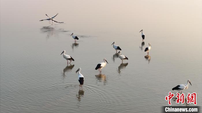 Photo shows oriental white storks at Chouxie Lake in Tanli village, Nanfeng township, Duchang county, east China's Jiangxi Province. (Photo/Yu Qiwen)