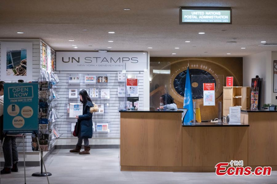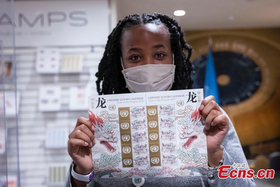 A staff member displays a stamp sheet of the Year of the Dragon at the United Nations Postal Administration in New York City, the United States Jan. 19, 2024. (Photo: China News Service/Wang Fan)
