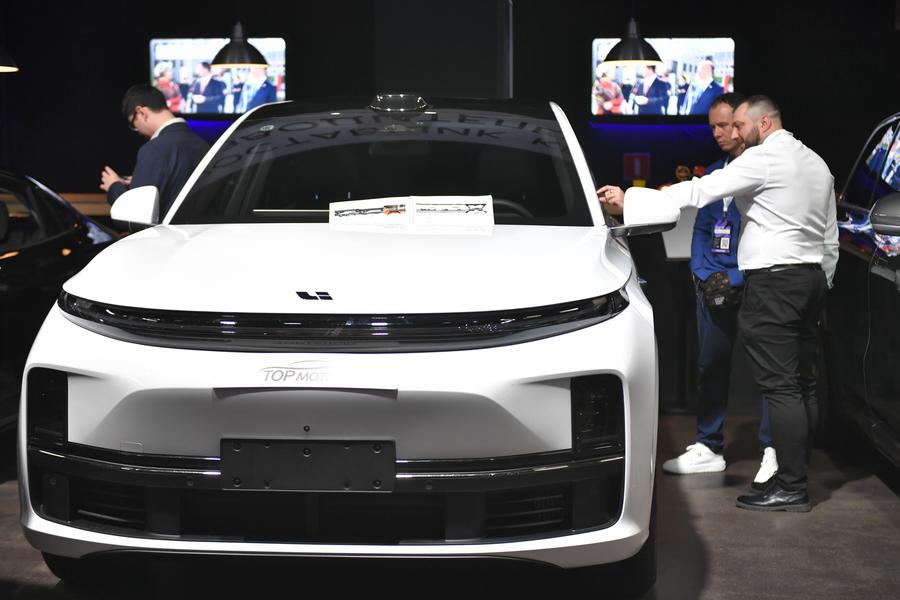 Visitors look at a car from Chinese car brand Li Auto during the CarX exhibition-forum in Moscow, Russia, on Oct. 10, 2023. (Photo by Alexander Zemlianichenko Jr/Xinhua)