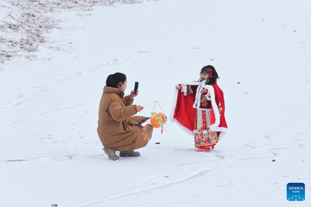 People enjoy the snow scenery at a park in Anding District of Dingxi, northwest China's Gansu Province, Jan. 21, 2024. (Photo by Chen Yonggang/Xinhua)