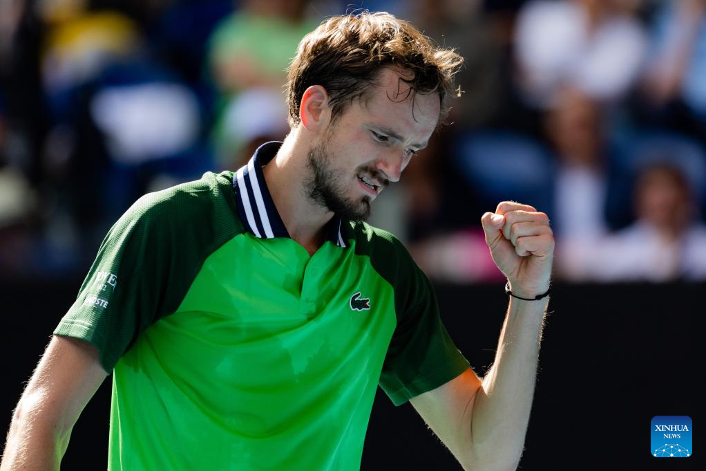 Daniil Medvedev celebrates during the men's singles 4th round match between Daniil Medvedev of Russia and Nuno Borges of Portugal at the Australian Open tennis tournament in Melbourne, Australia, Jan. 22, 2024. (Photo by Chu Chen/Xinhua)