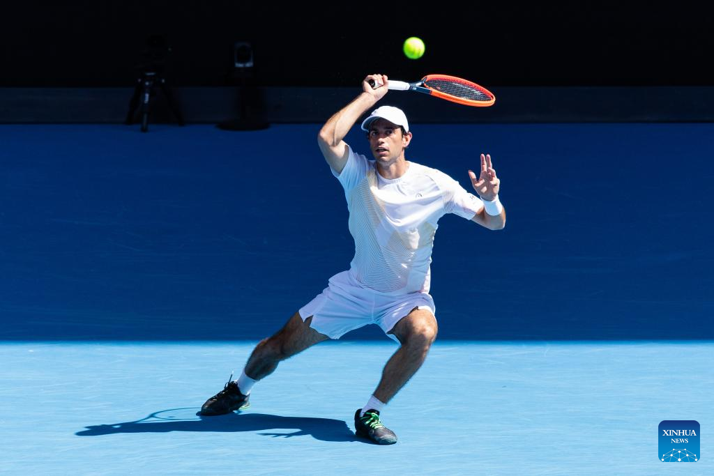 Nuno Borges competes during the men's singles 4th round match between Daniil Medvedev of Russia and Nuno Borges of Portugal at the Australian Open tennis tournament in Melbourne, Australia, Jan. 22, 2024. (Photo by Chu Chen/Xinhua)
