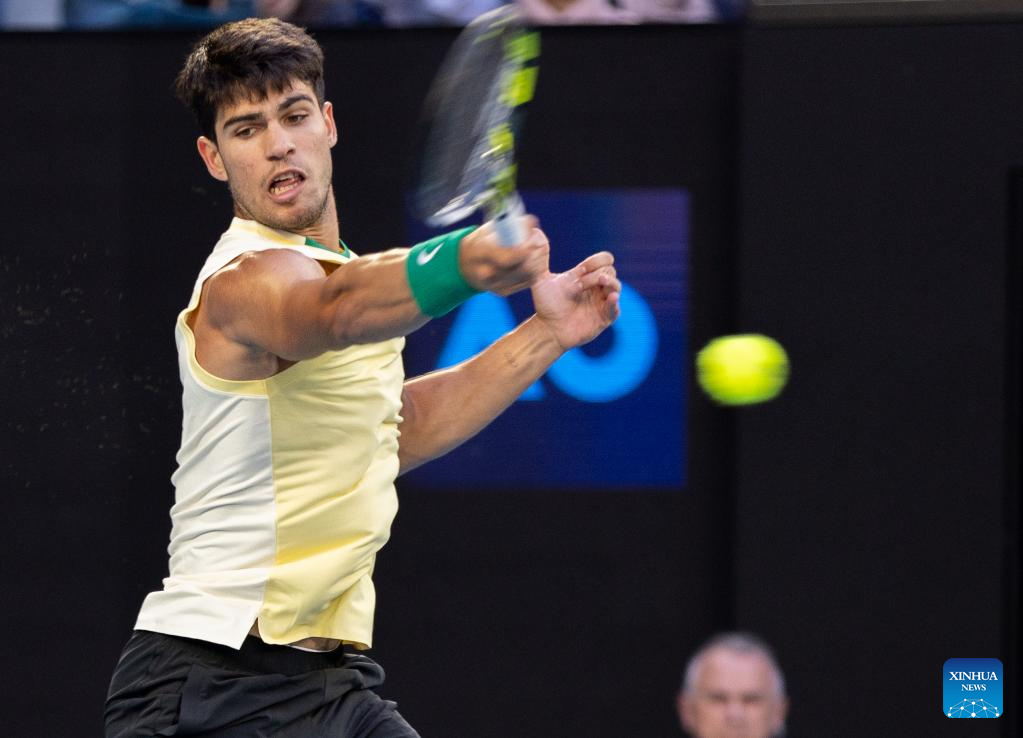 Carlos Alcaraz competes during the men's singles 4th round match between Carlos Alcaraz of Spain and Miomir Kecmanovic of Serbia at Australian Open tennis tournament in Melbourne, Australia, Jan. 22, 2024. (Photo by Hu Jingchen/Xinhua)