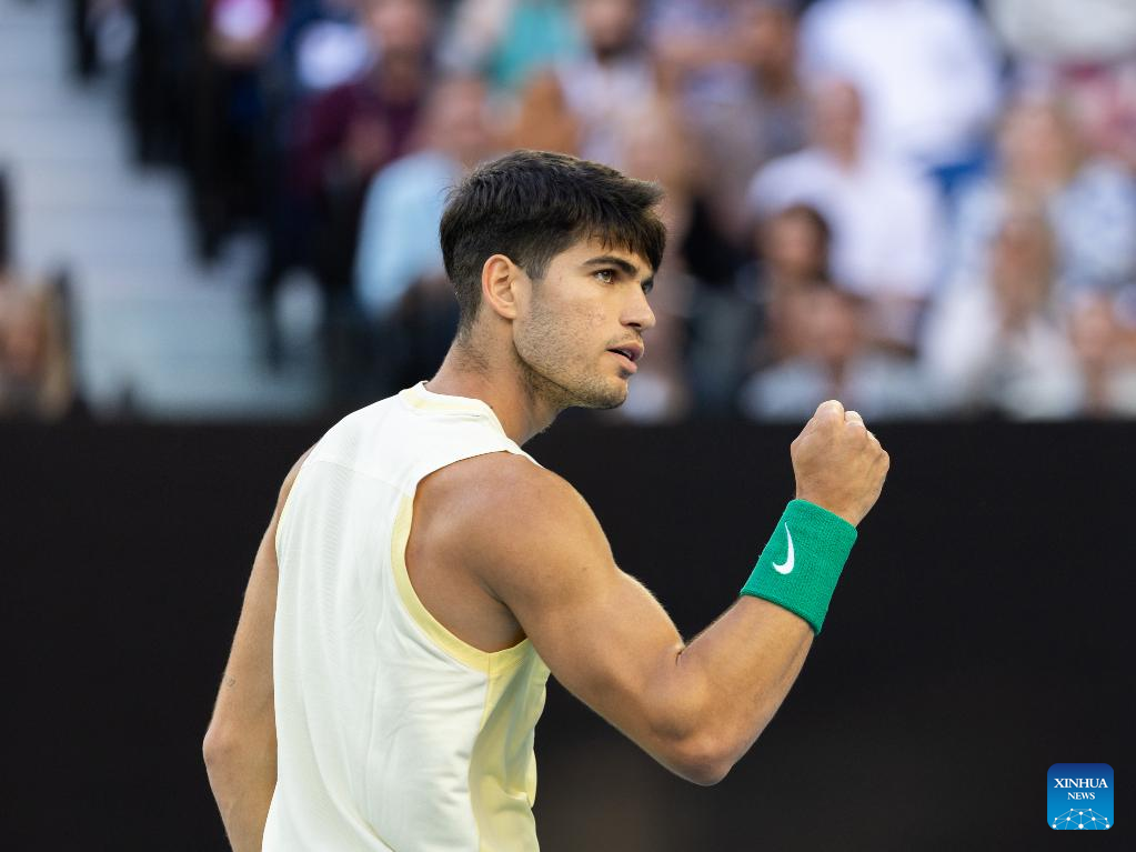 MELBOURNE, Australia, Jan. 22 (Xinhua) -- China's top-ranked player Zheng Qinwen and men's second seed Carlos Alcaraz submitted ruthless performances on Monday to storm into the quarterfinals of the Australian Open.