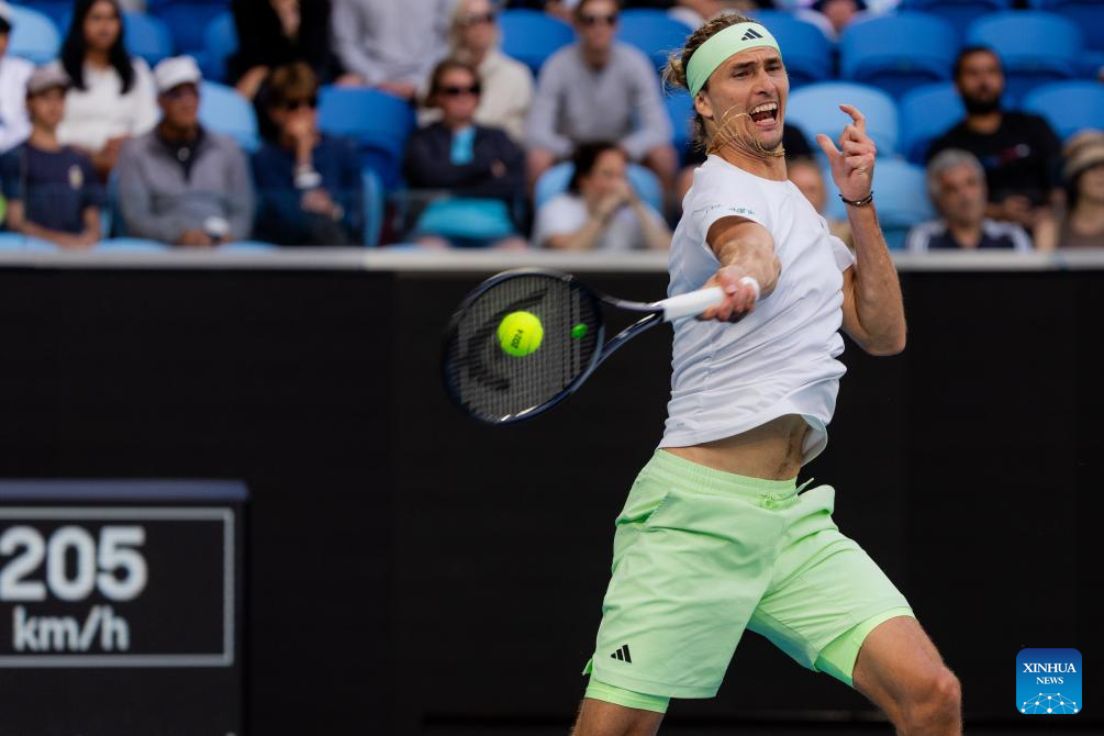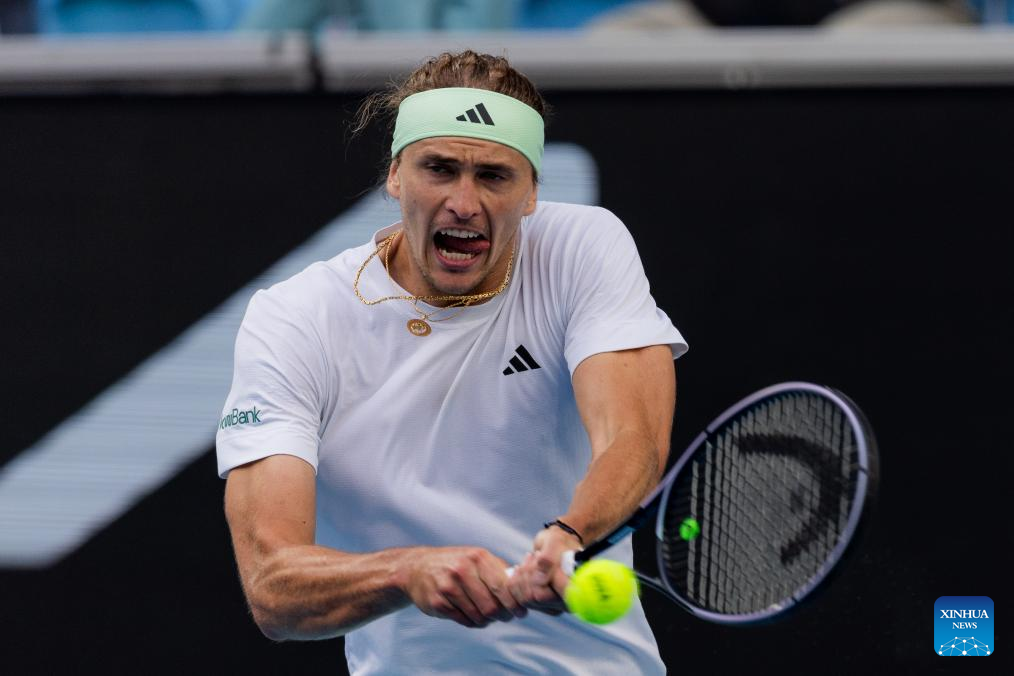 Alexander Zverev competes during the men's singles 4th round match between Alexander Zverev of Germany and Cameron Norrie of Britain at the Australian Open tennis tournament in Melbourne, Australia, Jan. 22, 2024. (Photo by Chu Chen/Xinhua)