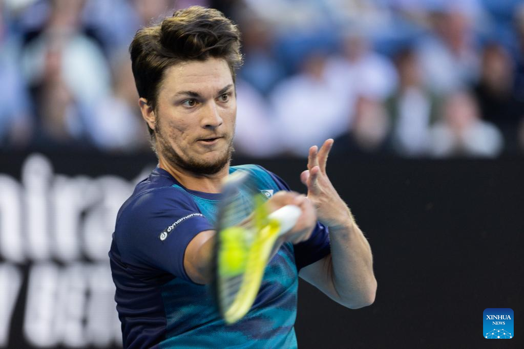 Arthur Cazaux of France competes during the men's singles 4th round match between Hubert Hurkacz of Poland and Arthur Cazaux of France at the Australian Open tennis tournament in Melbourne, Australia, Jan. 22, 2024. (Photo by Hu Jingchen/Xinhua)