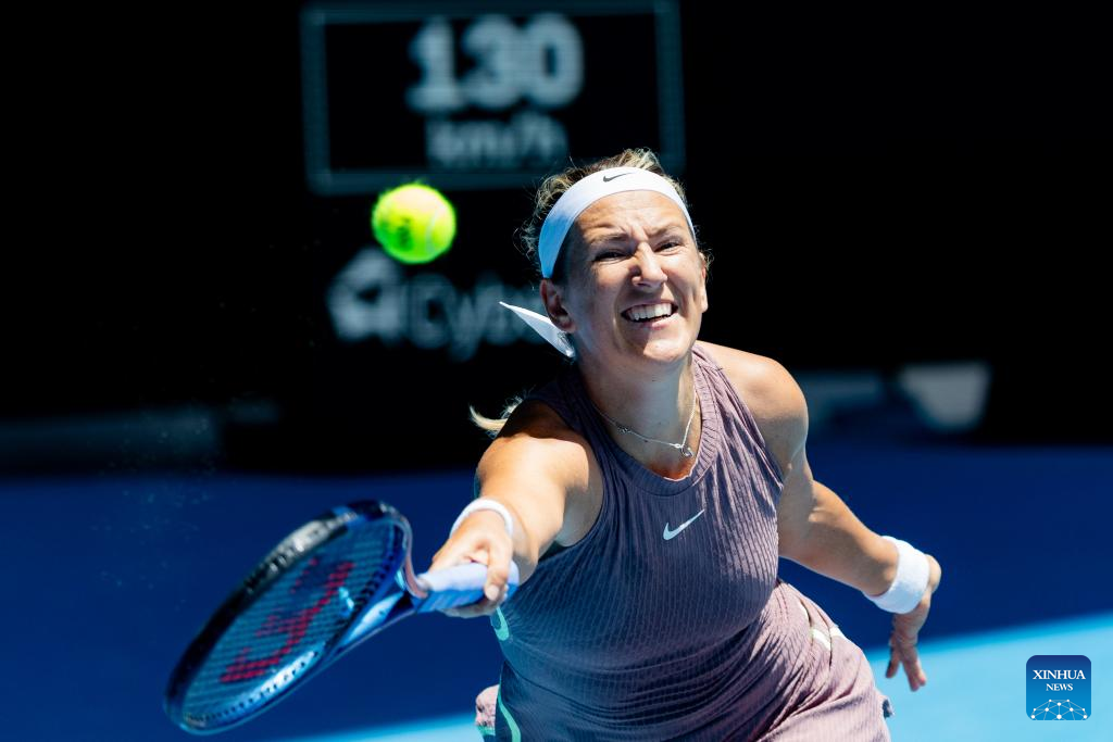 Victoria Azarenka competes during the women's singles 4th round match between Victoria Azarenka of Belarus and Dayana Yastremska of Ukraine at the Australian Open tennis tournament in Melbourne, Australia, Jan. 22, 2024. (Photo by Chu Chen/Xinhua)