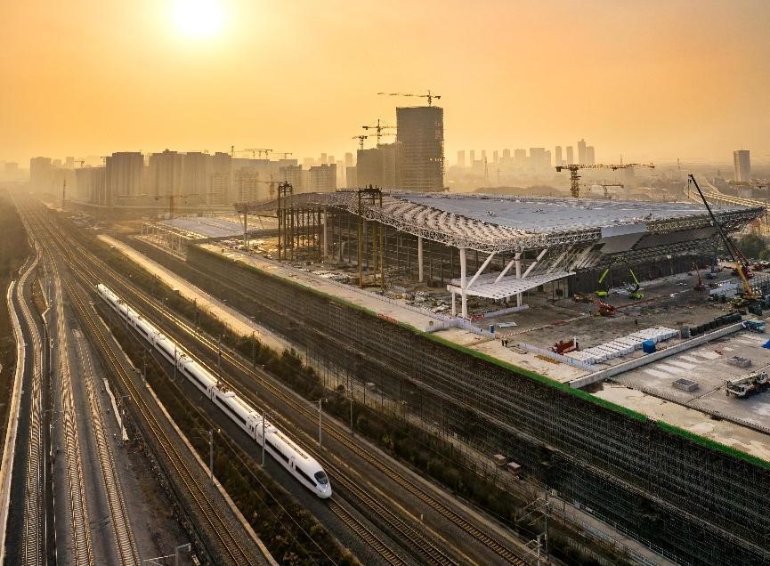 The Hefei West Railway Station is under construction in Hefei, east China's Anhui province, Dec. 31, 2023. (People's Daily Online/Luo Xianyang)