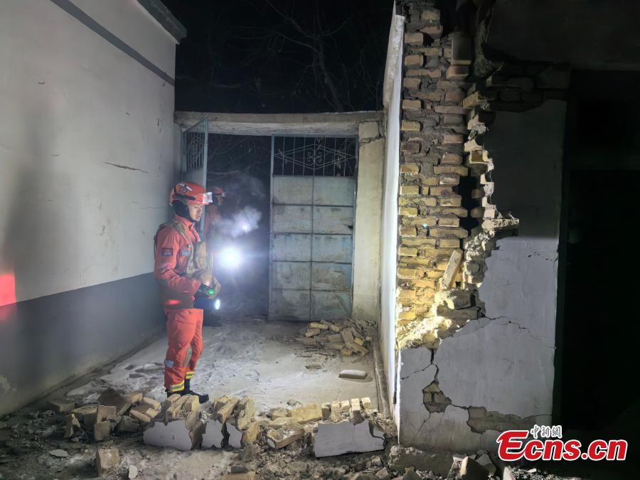 A rescuer checks the damage of a house after a 7.1-magnitude quake hit Wushi County of Aksu Prefecture in northwest China's Xinjiang Uygur Autonomous Region, Jan. 23, 2024. (Photo: China News Service/Wang Xudong)