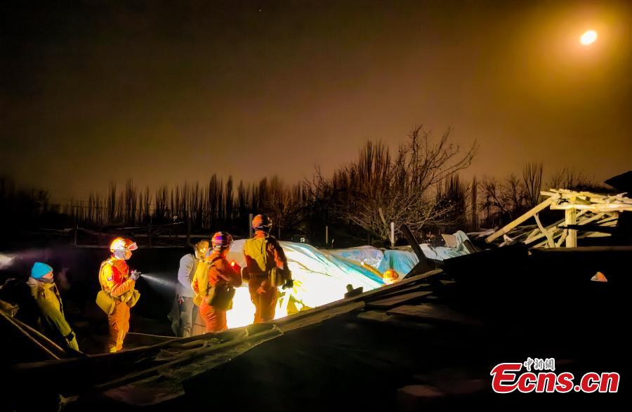Rescuers clear debris from a damaged house in Wushi County of Aksu Prefecture, northwest China's Xinjiang Uygur Autonomous Region, Jan. 23, 2024. (Photo: China News Service/Wang Xudong)