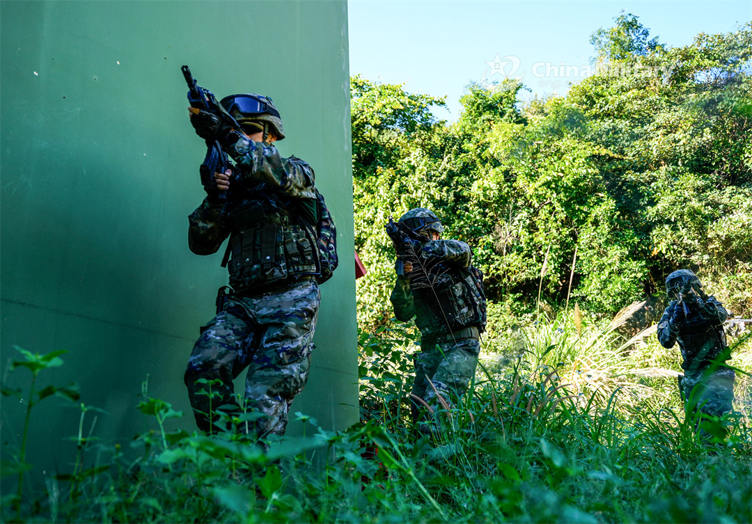 Soldiers assigned to the Sanya Detachment under the Chinese People's Armed Police (PAP) Force Hainan Corps patrol in coordination during a field training exercise on January 9, 2024. (eng.chinamil.com.cn/Photo by Huang Wentao)