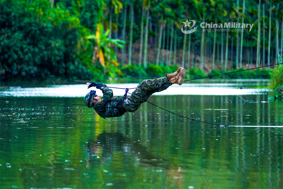 A soldier assigned to the Sanya Detachment under the Chinese People's Armed Police (PAP) Force Hainan Corps crosses a river on a one-rope bridge during a field training exercise on January 9, 2024. (eng.chinamil.com.cn/Photo by Huang Wentao)