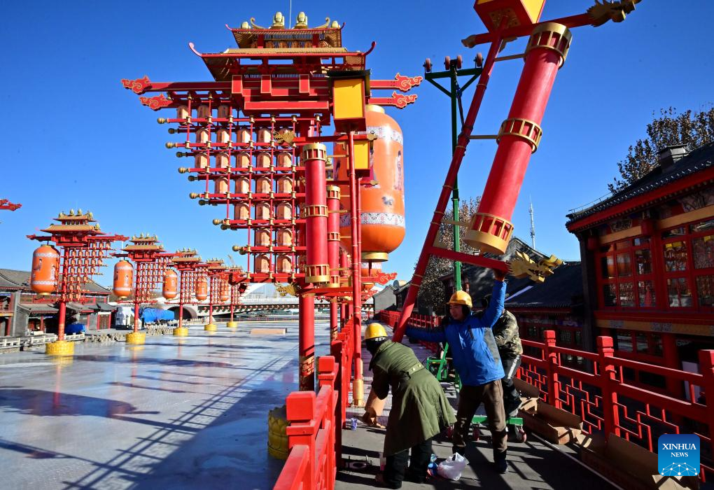 People set up decorations at a scenic area ahead of the upcoming Chinese Lunar New Year in Fengnan District of Tangshan, north China's Hebei Province, Jan. 23, 2024. (Xinhua/Yang Shiyao)