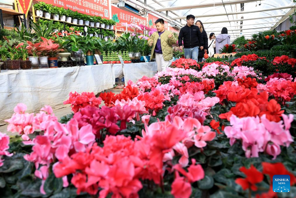 People shop for flowers at a local market in Shijiazhuang, north China's Hebei Province, Jan. 23, 2024. Various events are held across the country in celebration of the upcoming Chinese Lunar New Year, which falls on Feb. 10 this year. (Photo by Liang Zidong/Xinhua)