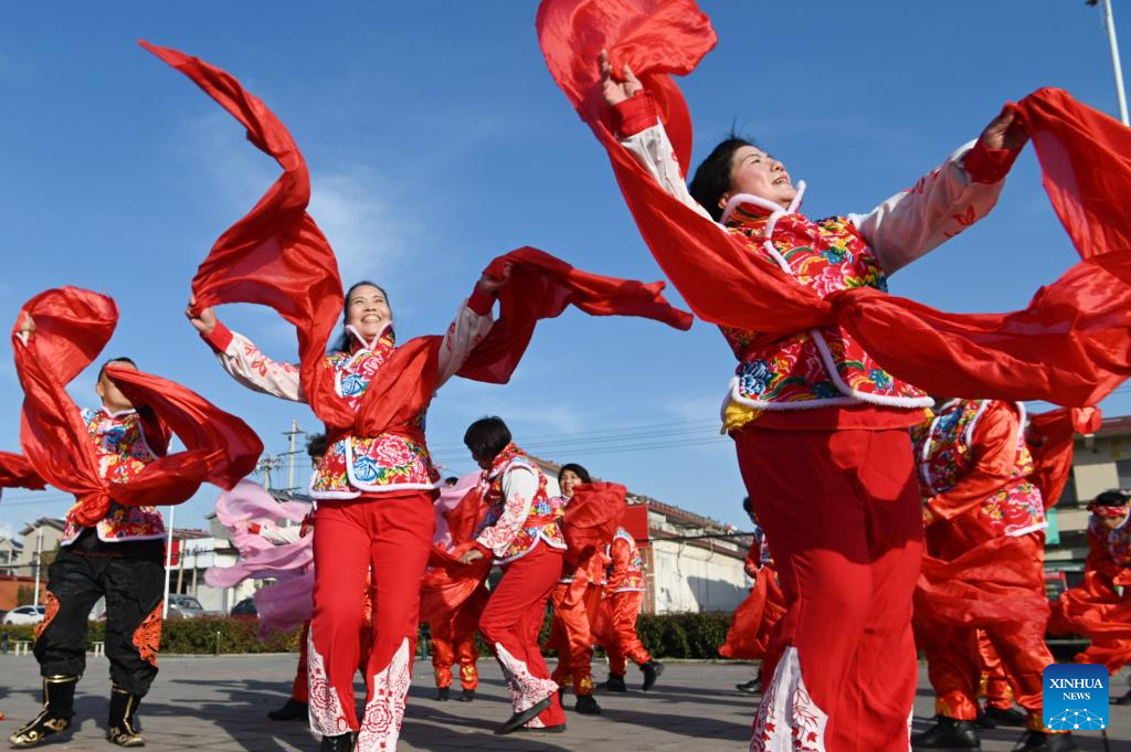People perform traditional Yangge dance in Qinyang City, central China's Henan Province, Jan. 23, 2024. Various events are held across the country in celebration of the upcoming Chinese Lunar New Year, which falls on Feb. 10 this year. (Photo by Yang Fan/Xinhua)