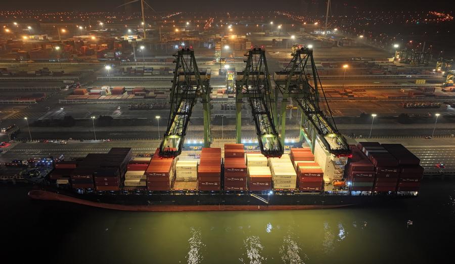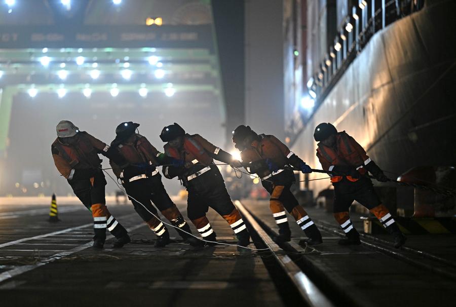 Staff members tie up a container vessel loaded with imported cherries at a container terminal of Tianjin Port in north China's Tianjin, Jan. 16, 2024. (Xinhua/Zhao Zishuo)