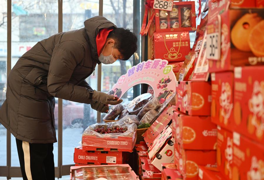 A customer selects Chilean cherries at a store in north China's Tianjin, Jan. 20, 2024. (Xinhua/Zhao Zishuo)