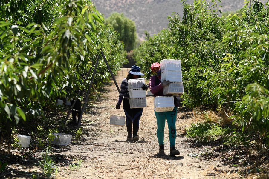 Workers transport newly harvested cherries at a plantation near Santiago, Chile, Dec. 5, 2019. (Photo by Jorge Villegas/Xinhua)