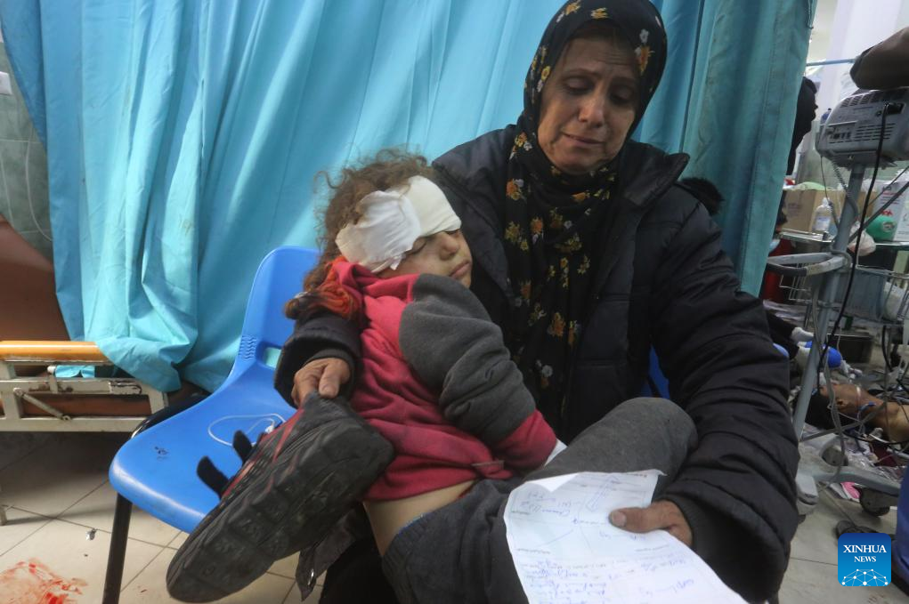 A woman holds an injured girl at a hospital in the southern Gaza Strip city of Rafah, on Jan. 23, 2024. The Palestinian death toll from the ongoing Israeli attacks on the Gaza Strip has risen to 25,490 since Oct. 7, 2023, the Hamas-run health ministry said on Tuesday. (Photo by Khaled Omar/Xinhua)