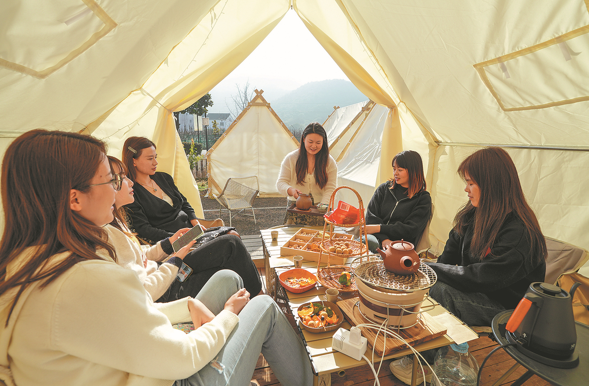 Food and drinks are served to visitors in a tent and at an outdoor table at a homestay in Suzhou. LI BO/XINHUA