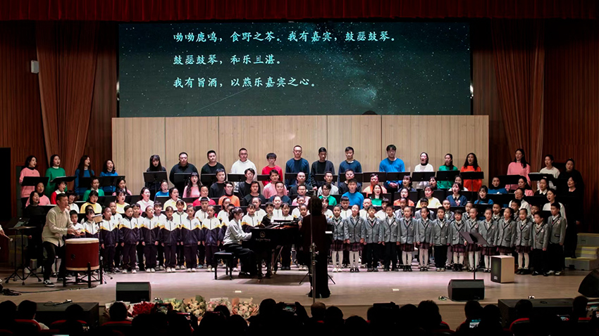 During the rehearsal, they sang a song adapted from a poem in "The Book of Songs," China's first anthology of poems dating back more than 2,000 years. The sonorous voices of teachers and crystal-clear voices of children injected new vitality into the famous ancient poem, with the song serving as a reminder of the public's cultural memory.