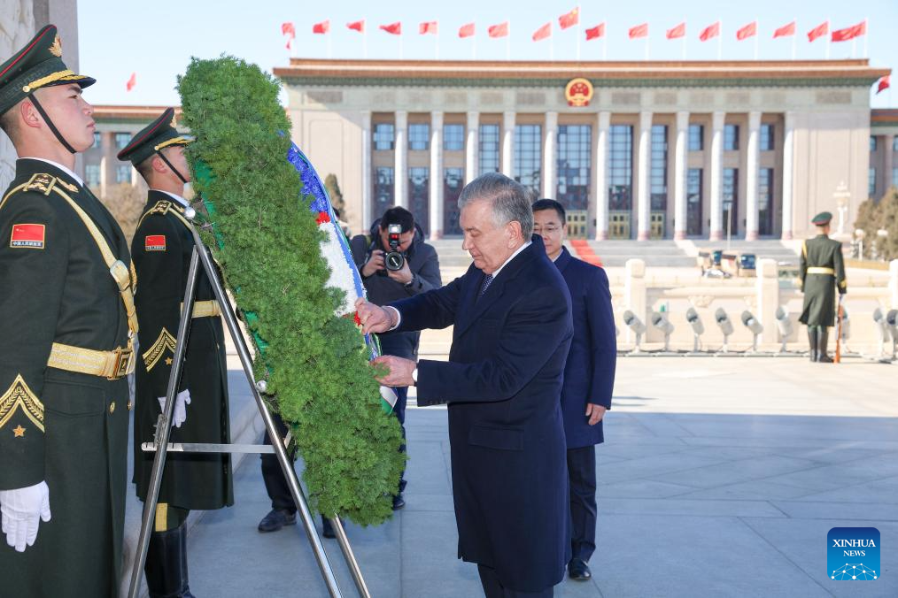 Uzbek president lays wreath at Monument to People's Heroes in Beijing