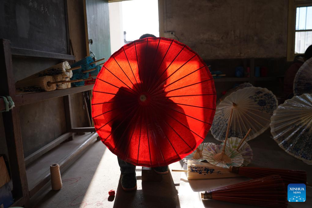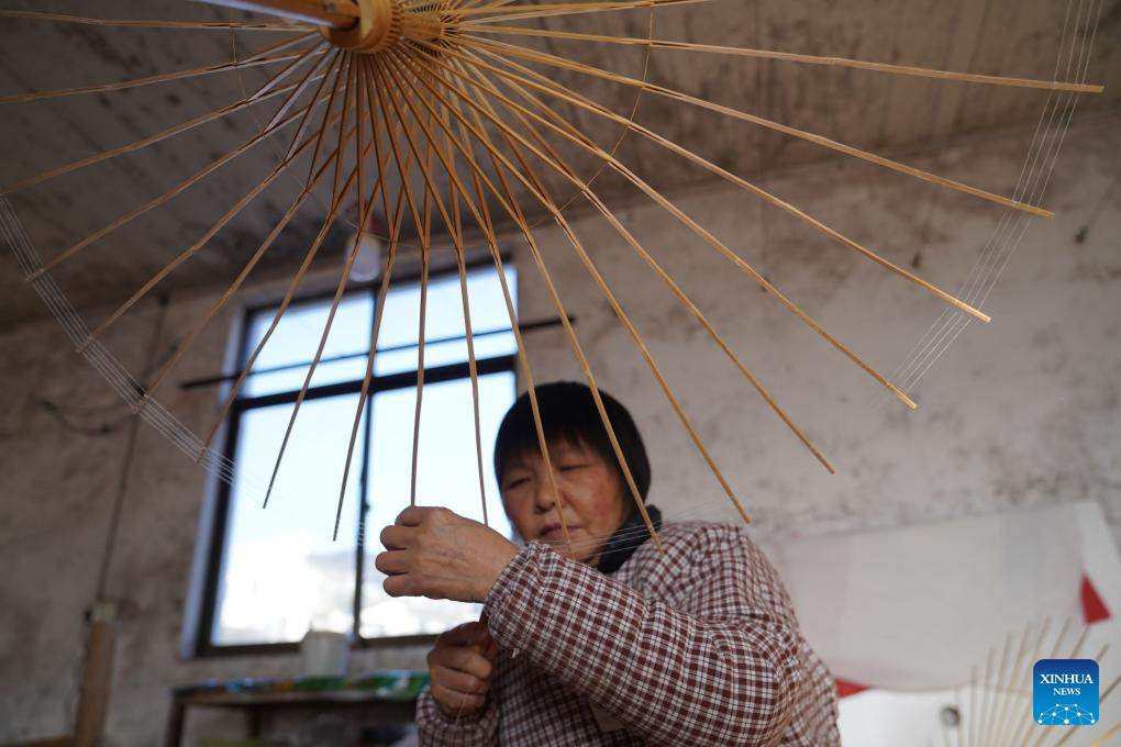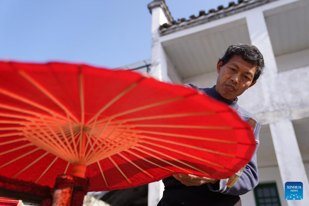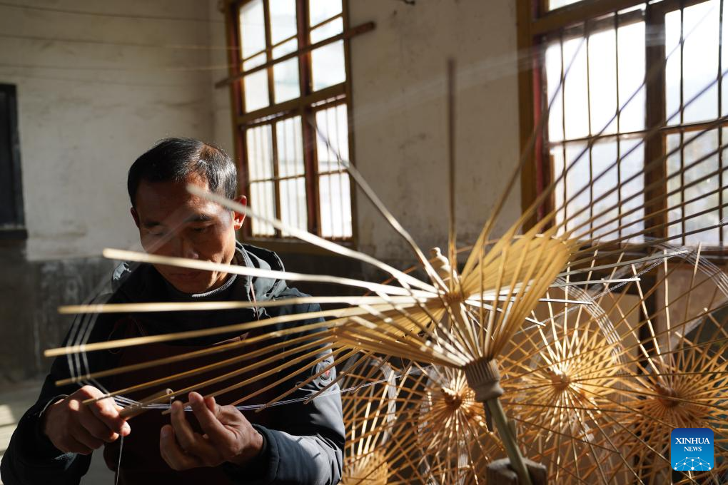 A man assembles a Jialu paper umbrella in Wuyuan, east China's Jiangxi Province, Jan. 10, 2024. (Xinhua/Zhou Mi)