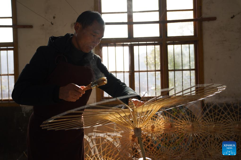 A man applies water-resistant oil to a Jialu paper umbrella in Wuyuan, east China's Jiangxi Province, Jan. 11, 2024. (Xinhua/Zhou Mi)