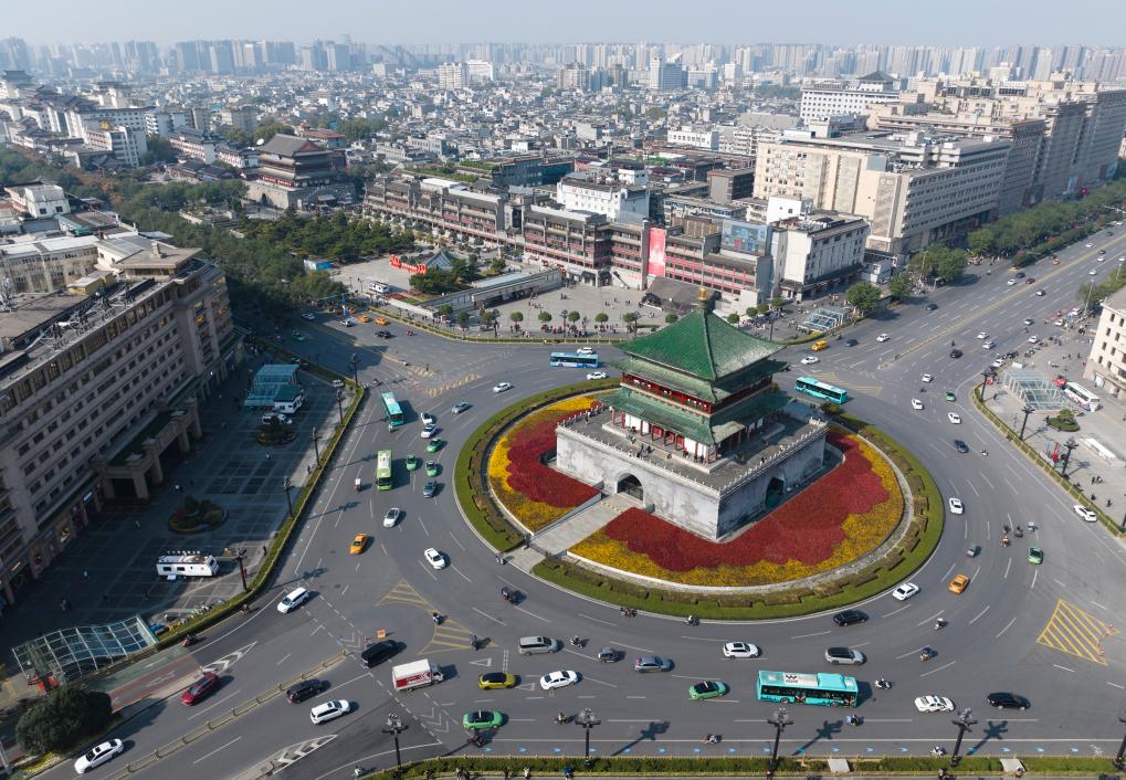An aerial drone photo taken on Nov. 13, 2023 shows Bell Tower in Xi'an, northwest China's Shaanxi Province. (Xinhua/Shao Rui)