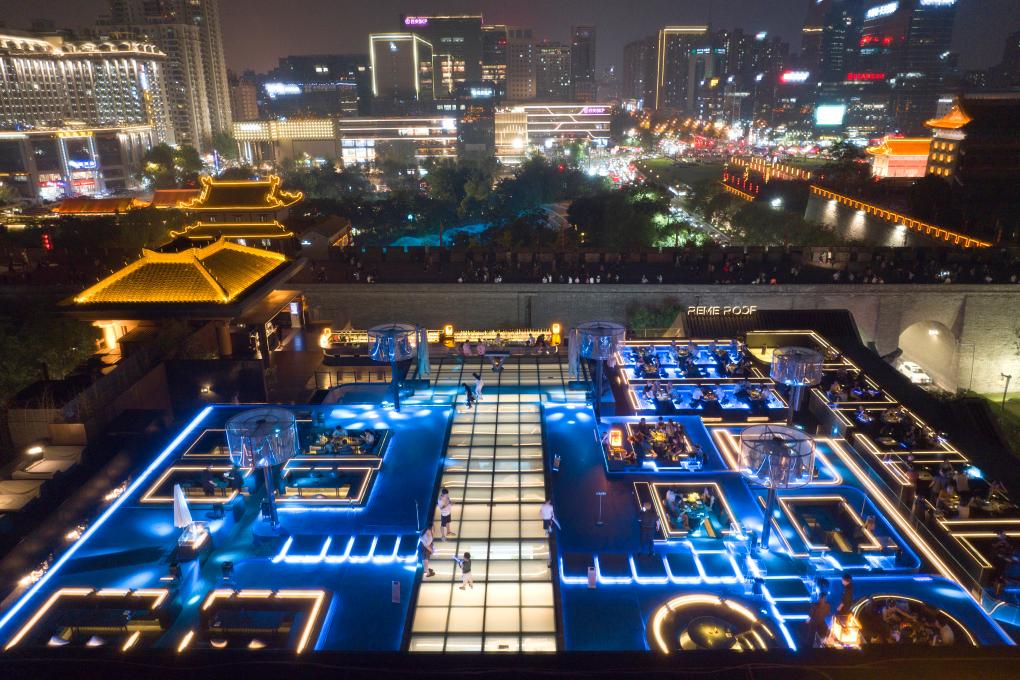 An aerial drone photo taken on Aug. 10, 2023 shows people enjoying themselves at a bar in Xi'an, northwest China's Shaanxi Province. (Xinhua/Shao Rui)