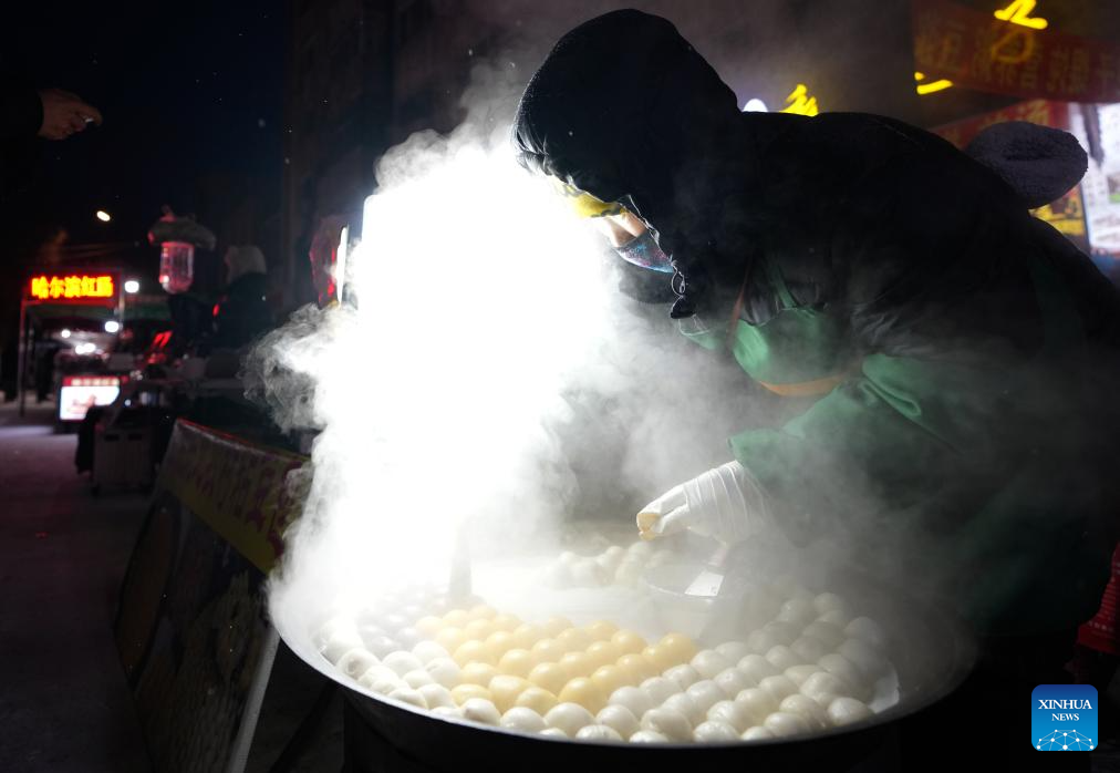 A vendor sells sticky steamed buns stuffed with bean paste at the Hongzhuan Morning Market in Harbin, northeast China's Heilongjiang Province, Jan. 22, 2024. (Xinhua/Wang Yuguo)
