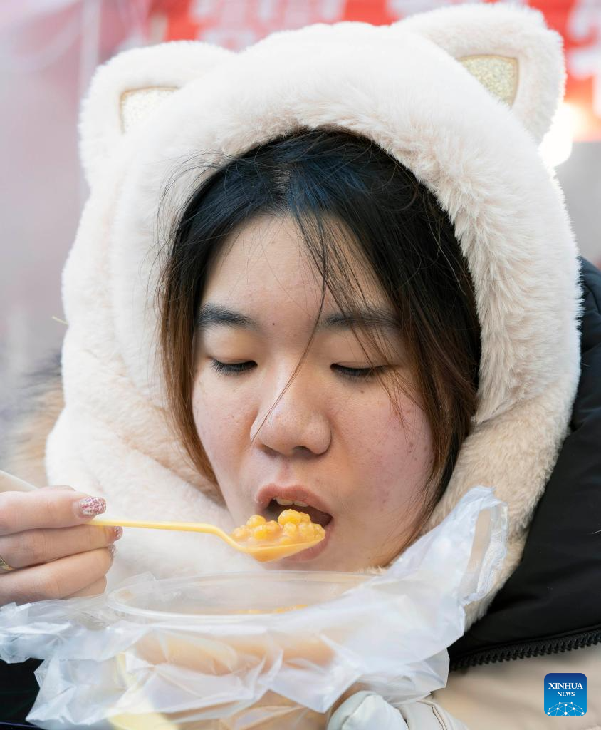 A tourist tastes corn porridge at the Hongzhuan Morning Market in Harbin, northeast China's Heilongjiang Province, Jan. 22, 2024. (Xinhua/Cai Yang)