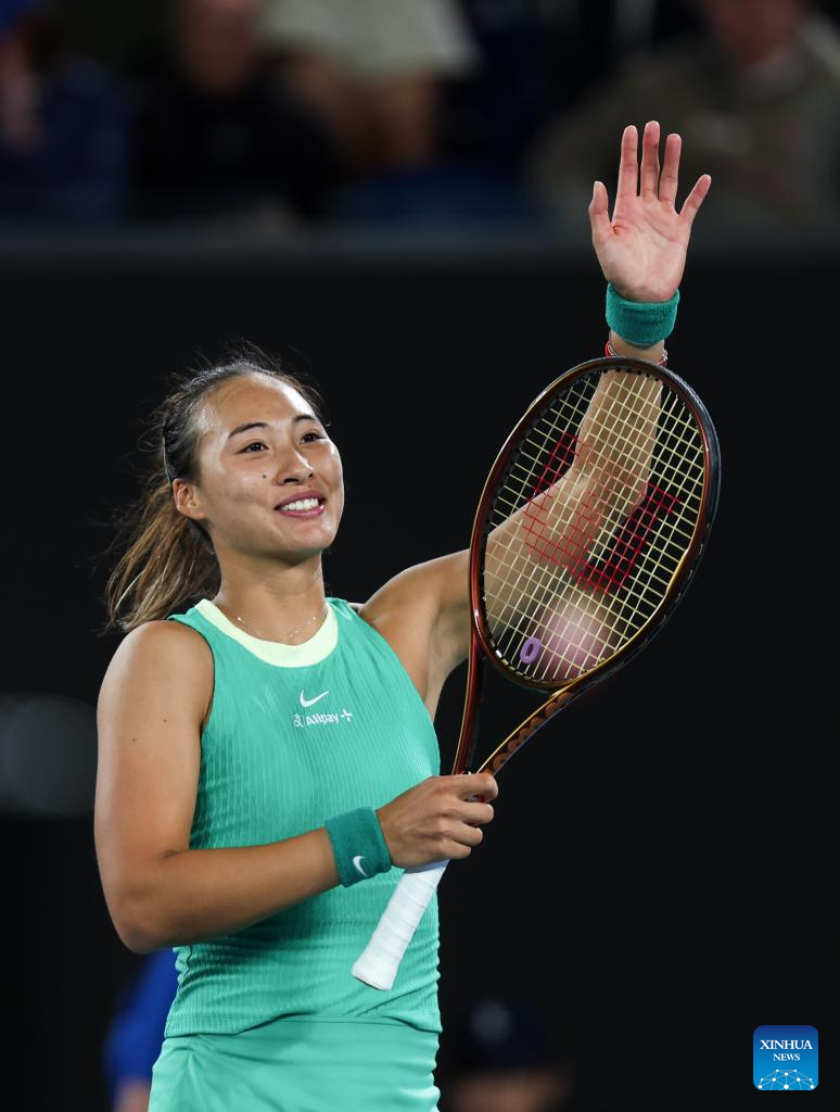 Zheng Qinwen of China greets spectators after winning the women's singles quarterfinal against Anna Kalinskaya of Russia at Australian Open tennis tournament in Melbourne, Australia, Jan. 24, 2024. (Xinhua/Ma Ping)