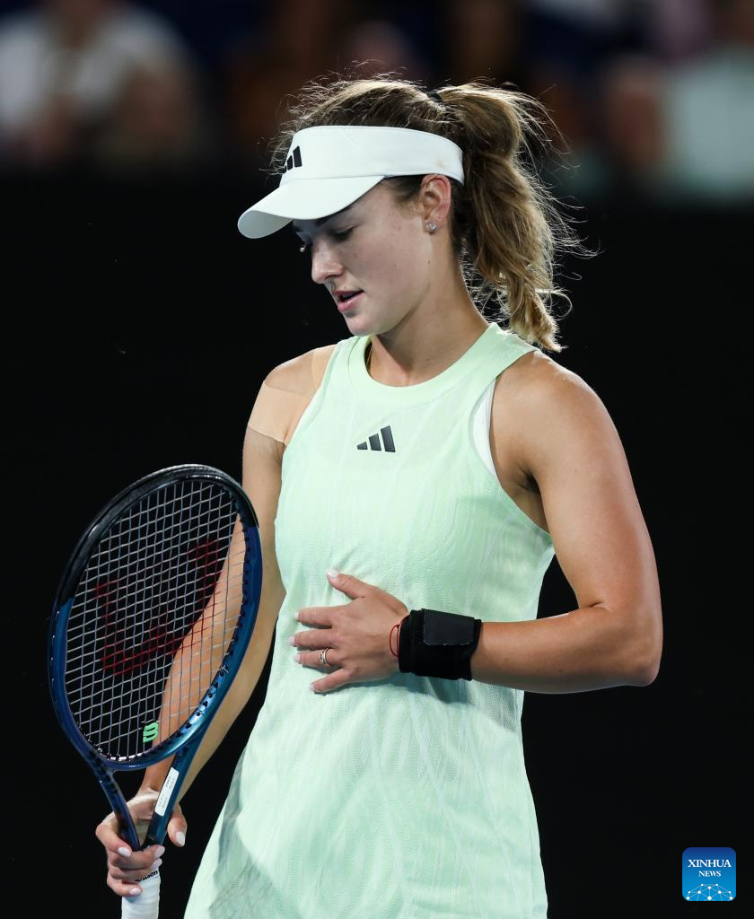 Anna Kalinskaya of Russia reacts during the women's singles quarterfinal against Zheng Qinwen of China at Australian Open tennis tournament in Melbourne, Australia, Jan. 24, 2024. (Xinhua/Ma Ping)