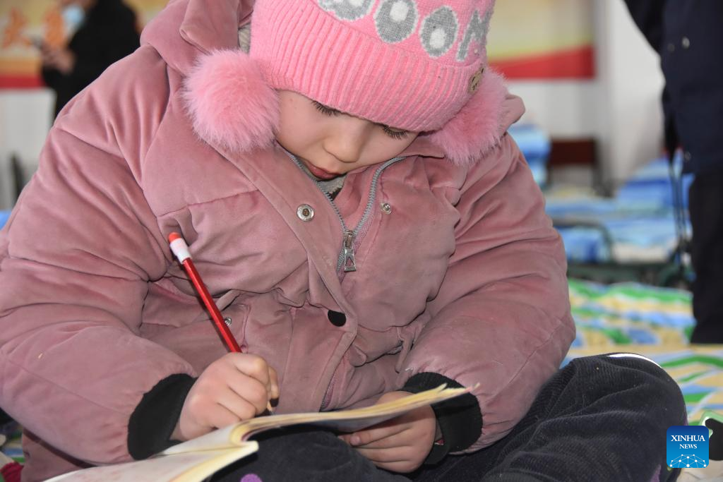 Children do homework at a resettlement site in Wushi County, northwest China's Xinjiang Uygur Autonomous Region, Jan. 24, 2024. (Xinhua/Gu Yu)