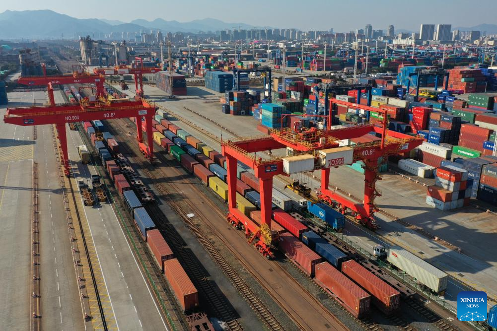 Cranes and sea-rail intermodal trains work at the Beilun port railway station of the Ningbo-Zhoushan Port in east China's Zhejiang Province, Jan. 24, 2024. (Xinhua/Huang Zongzhi)
