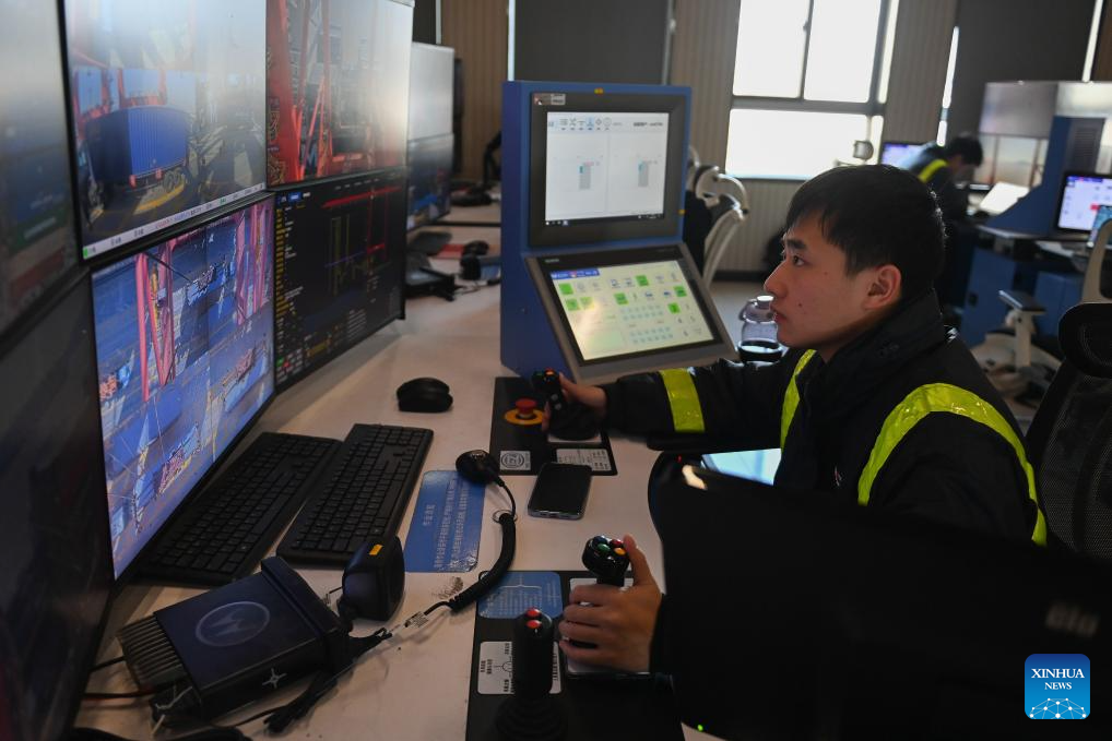A staff member works at the control center at the Meishan port area of the Ningbo-Zhoushan Port in east China's Zhejiang Province, Jan. 24, 2024. (Xinhua/Huang Zongzhi)