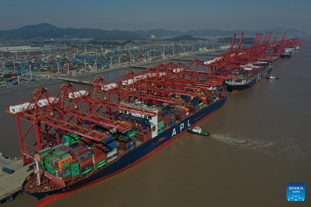 Cranes and trucks work at a container terminal at the Meishan port area of the Ningbo-Zhoushan Port in east China's Zhejiang Province, Jan. 24, 2024. (Xinhua/Huang Zongzhi)