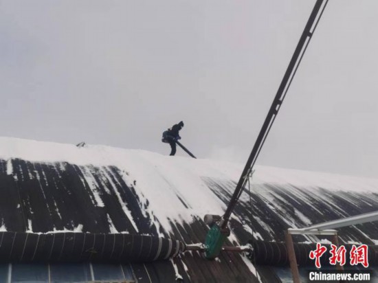 Xu Lianghe cleans snow on the rooftop of a greenhouse. (Photo courtesy of Xu Lianghe)