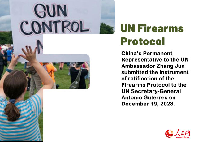 China’s Permanent Representative to the UN Ambassador Zhang Jun submitted the instrument of ratification of the Firearms Protocol to the UN Secretary-General Antonio Guterres on December 19, 2023. The ratification of the Firearms Protocol is yet another major step taken by China to implement the Global Security Initiative, practice multilateralism and uphold international and regional peace and stability.