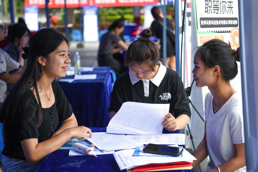 A college graduate (R) inquires about job opportunities at a job fair in Qiandongnan Miao and Dong Autonomous Prefecture, southwest China's Guizhou Province, June 30, 2023. (Xinhua/Yang Wenbin)